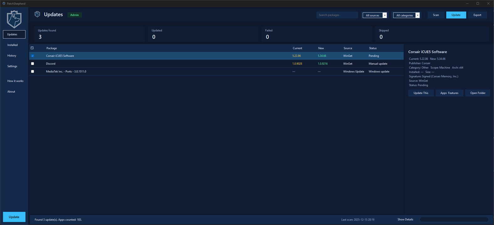Tired of manually checking for app updates? PatchShepherd does it all for you! One click scans all your installed apps and updates them automatically using trusted tools like WinGet, Chocolatey, and Scoop. Stay secure, stay current, and save hours of tedious maintenance.